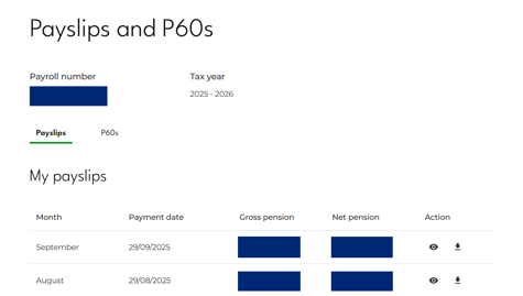 3. When you access your payslips and P60s, you'll be taken to a screen similar to below, where you can view your P60s and monthly pension payslips. Your payslip will show your tax code, gross pension and other deductions to your pension.
